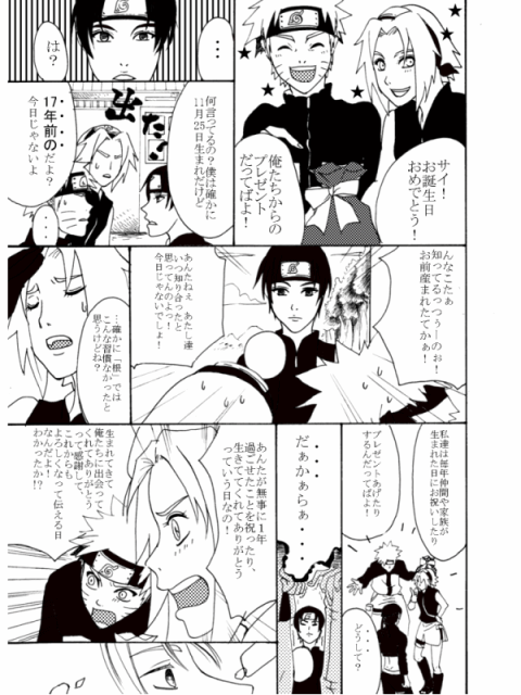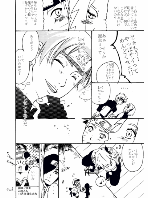 お誕生日おめでとうサイ!イズモさん!イズモさんイケメンだね!改めて見ましたが。サイはかわいい。イイ身体だし。好きです。また描きたい。そして実は私も誕生日!!おそろいなのだ!!わーい!!なんかとてもうれしいぞ!!ということで初めてのキャラ誕祝いがこのお二人になりました。は、はじめてSAIで漫画描いたんだ!!ベタが感動。チョー早いのね。トーンも楽なのかなぁ。まだ操作慣れないのでよくわからないけど。これがきれいに印刷できればあとは何も言うことないなぁ。まさかレーザーがいいなんて・・・。インクジェット買い換えたばかりだよ・・・。とほ~。 なにはともあれ、もっかい!おめでとうサイ!イズモさん!!